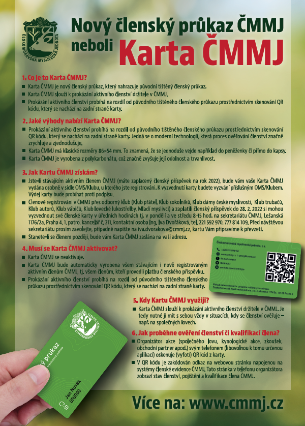 Členové, kteří jsou registrováni v ČMMJ přes odborný klub (Klub přátel, Klub sokolníků, Klub dámy české myslivosti,  Klub trubačů, Klub autorů, Klub vábičů, Klub lovecké lukostřelby, Mladí myslivci klub) a zaplatili členský příspěvek do 28.2.2022 si mohou vyzvednout své členské karty v úředních hodinách tj. v pondělí a ve středu 8-15 hod. na sekretariátu ČMMJ, Lešanská 1176/2a, Praha 4, 1. patro, kancelář č. 211, kontaktní osoba Ing. Iva Dvořáková, tel. 221 592 970, 777 814 109. Před návštěvou sekretariátu prosím zavolejte, případně napište na vin.qibenxbin@pzzw.pm, kartu Vám připravíme k převzetí.