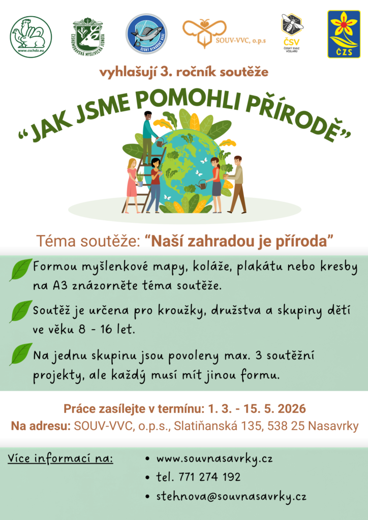 Ve spolupráci s Českým svazem chovatelů, Českým rybářským svazem, Středním odborným učilištěm včelařským, Českým svazem včelařů a Českým zahrádkářským svazem vyhlašujeme 3. ročník kreativní soutěže pro kroužky, dětské skupiny i třídní kolektivy „Jak jsme pomohli přírodě“. V loňském roce tuto soutěž vyhrál Myslivecký kroužek Zelenáč Petrovice u Sedlčan.