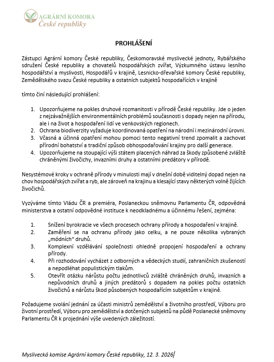 Praha, 12. března 2026 – Zdraví naší přírody a její druhová rozmanitost jsou v sázce. Českomoravská myslivecká jednota se dnes připojila k široké koalici organizací zastupujících zemědělce, rybáře, lesníky a chovatele, aby společně upozornila na znepokojivý vývoj v českých regionech. Představitelé těchto institucí dnes vydali společné prohlášení, v němž žádají stát o odklon od nesystémových opatření a návrat k odborně podložené péči o krajinu.