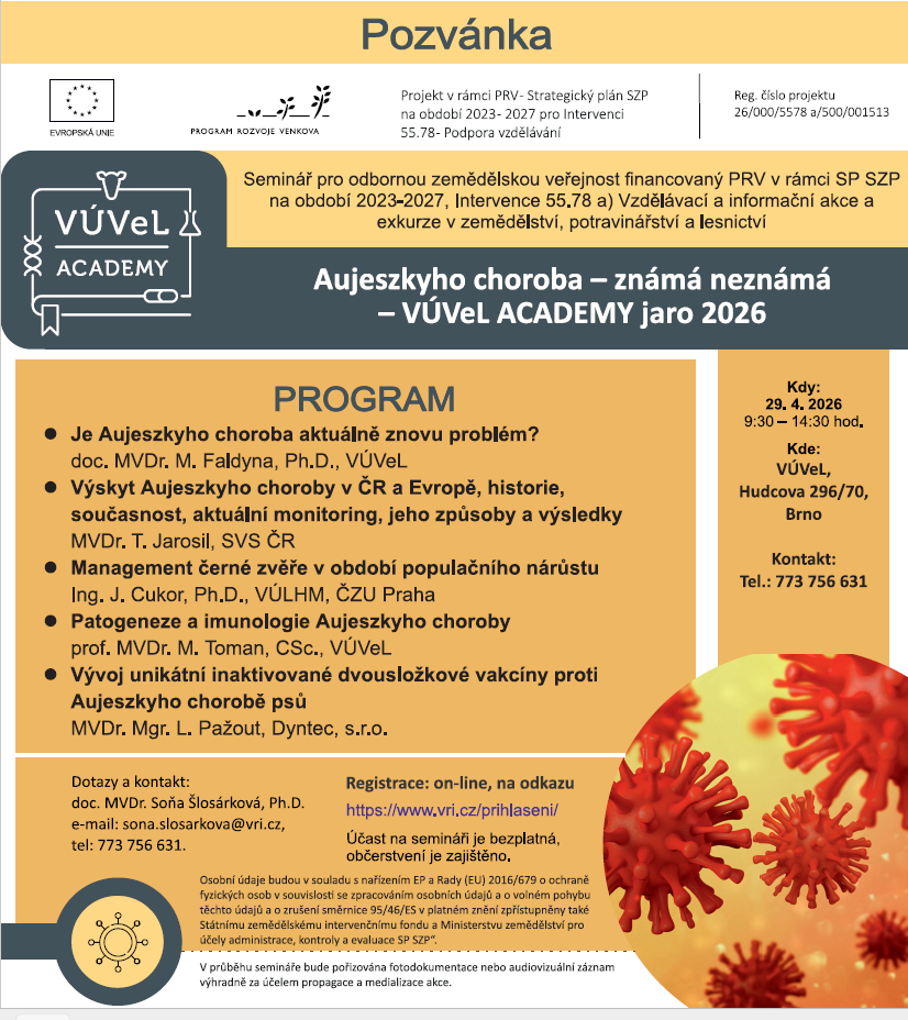 Výzkumný ústav veterinárního lékařství (VÚVeL) v rámci svého vzdělávacího cyklu VÚVeL ACADEMY jaro 2026 pořádá odborný seminář zaměřený na téma, které je pro nás, myslivce, stále více než aktuální: Aujeszkyho chorobu.